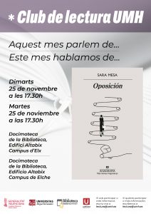 Aquest últim dimarts de mes, dia 25 de novembre, vam celebrar la nostra sessió del Club de Lectura UMH per a parlar de la novel·la Oposición, de Sara Mesa. Com sempre, fou una trobada molt interessant en la qual la diversitat de parers i de gustos es va fer palesa entre les persones assistents, cadascú va poder expressar el viscut a través de la lectura personal de la novel·la i hi hagué tota mena d’experiències.