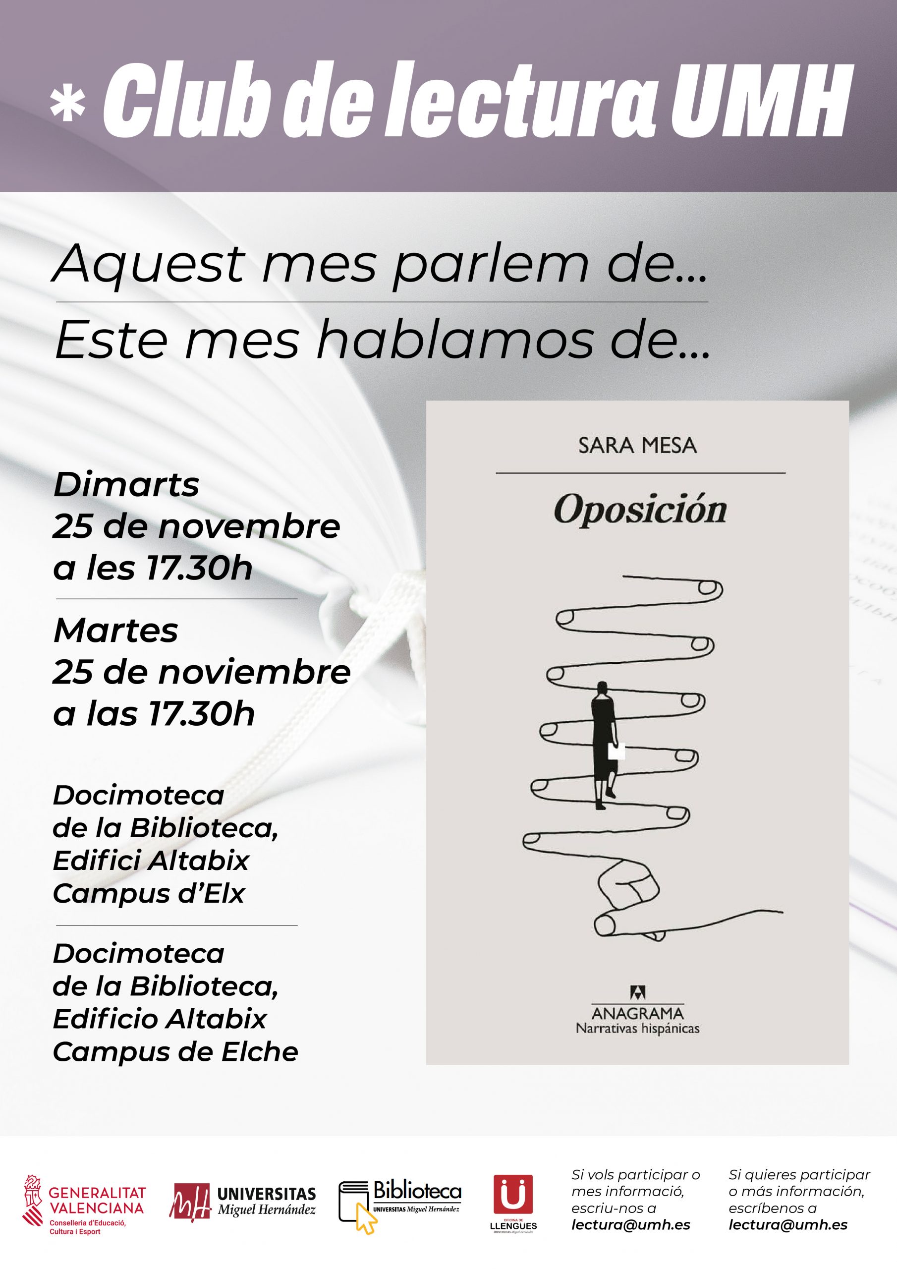 Aquest últim dimarts de mes, dia 25 de novembre, vam celebrar la nostra sessió del Club de Lectura UMH per a parlar de la novel·la Oposición, de Sara Mesa. Com sempre, fou una trobada molt interessant en la qual la diversitat de parers i de gustos es va fer palesa entre les persones assistents, cadascú va poder expressar el viscut a través de la lectura personal de la novel·la i hi hagué tota mena d’experiències.