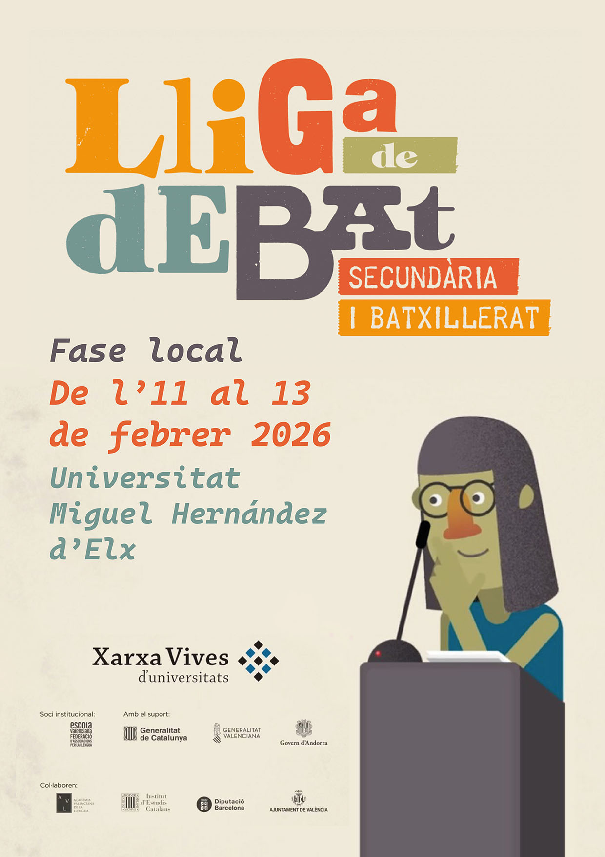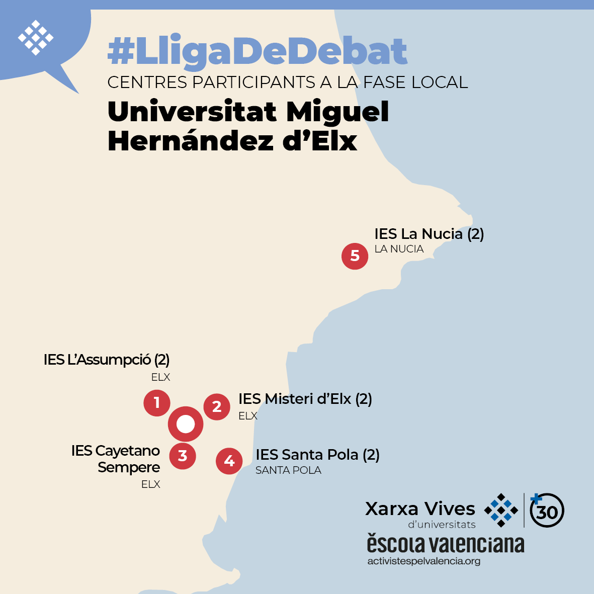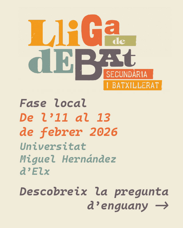 Durant la fase local de la Lliga de debat de secundària i batxillerat de la Xarxa Vives 2026, els debats tindran lloc del dimecres 11 al divendres 13, a les aules 0.4 i 0.2 de l’edifici La Vallverda, del campus d’Elx de la Universitat Miguel Hernández d’Elx.