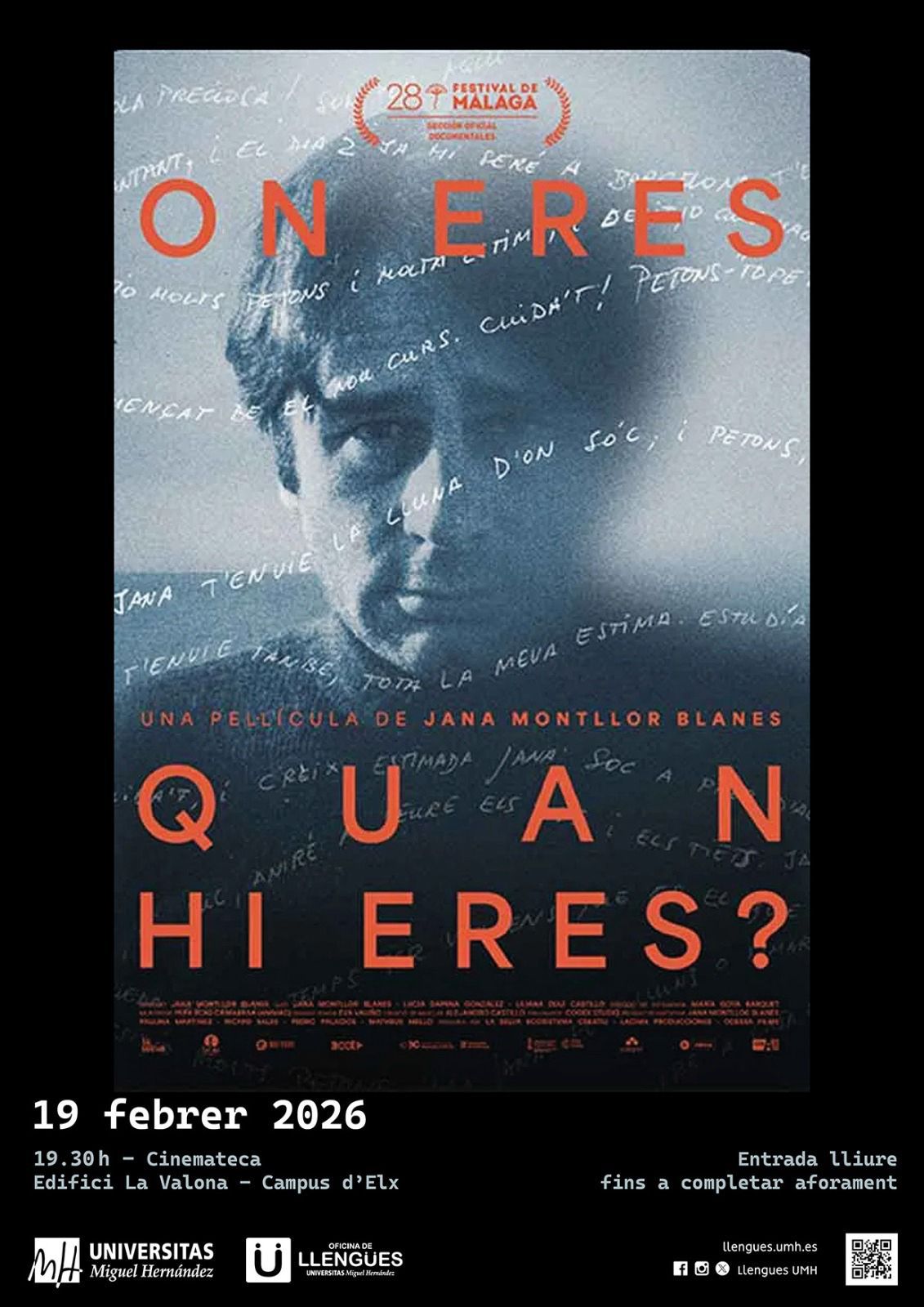 El Vicerectorat de Cultura, Igualtat i Diversitat de la Universitat Miguel Hernández d’Elx presenta el documental “On eres quan hi eres?”, pregunta que es fa la seua directora Jana Montllor Blanes sobre Ovidi Montllor, actor i cantautor alcoià, pertanyent al moviment de la Nova Cançó.