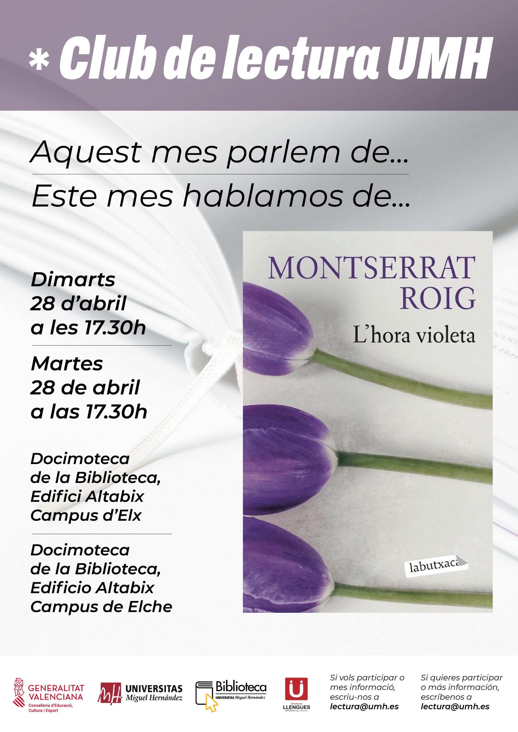 La pròxima cita del nostre Club de lectura UMH serà el dimarts, 28 d’abril, amb la novel·la L’hora violeta, de Montserrat Roig.